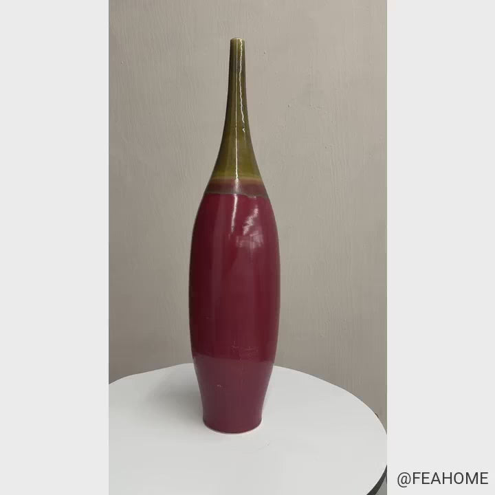 Glazed Apple Red Ceramic Vase with Skinny Mustard Green Neck