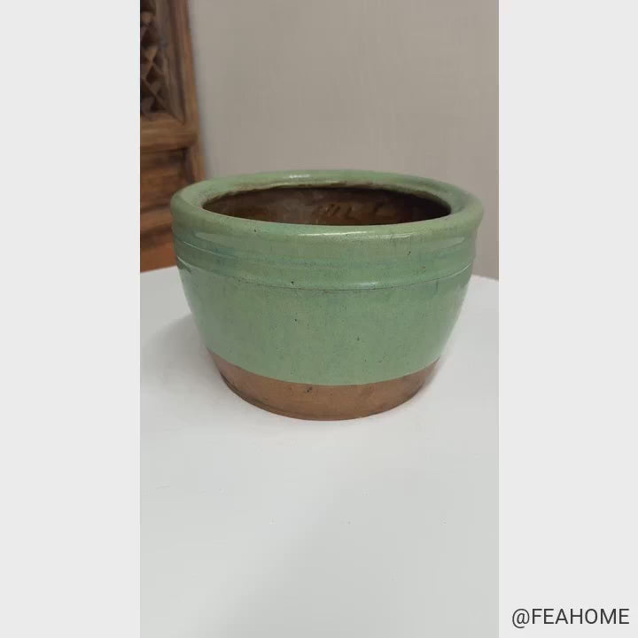 Simple, balanced, and quietly elegant, this vintage stoneware planter blends earthy authenticity with refined craftsmanship. The soft green celadon glaze wraps around its surface in a tranquil gradient, revealing warm clay tones near the base. Subtle crackling and kiln marks add texture and depth, giving the piece a natural sense of history and calm.
